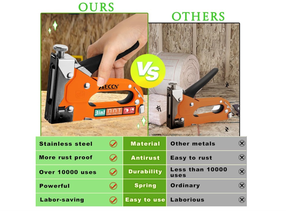 As a professional upholsterer with over 15 years of experience, I've used countless staple guns from various manufacturers. However, Aeccn staple gun's products truly stand out from the competition, offering a level of durability and precision that I haven't encountered elsewhere. Their 3-in-1 design is a game-changer, eliminating the need for multiple tools and making the job so much more efficient. In the past, I've had to switch between different guns for different staple types. With Aeccn staple gun, everything is handled by a single unit, streamlining the entire process and saving valuable time.
